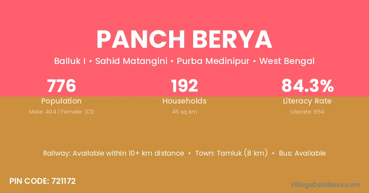 Tamluk (13 km) is the nearest town to Panch Berya village for major economic activities and is located approximately 13 km away.