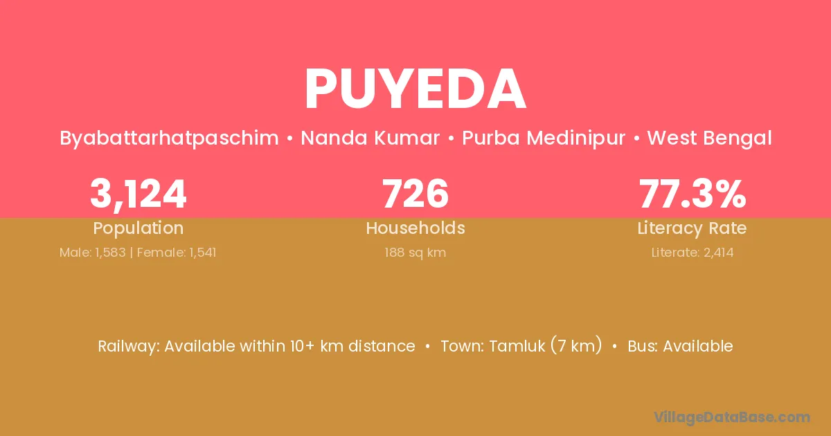 Tamluk (7 km) is the nearest town to Puyeda village for major economic activities and is located approximately 7 km away.
