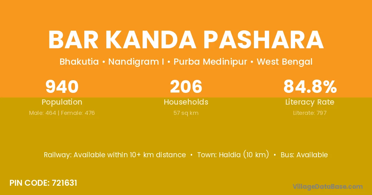 Haldia (10 km) is the nearest town to Bar Kanda Pashara village for major economic activities and is located approximately 10 km away.
