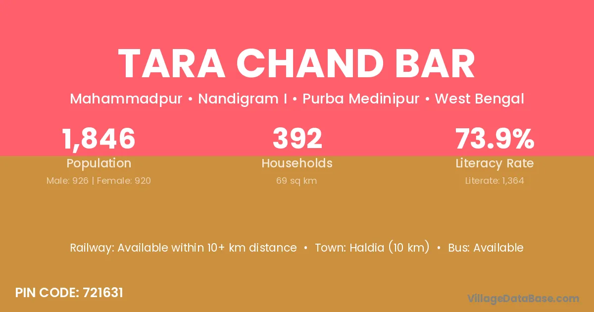 Haldia (10 km) is the nearest town to Tara Chand Bar village for major economic activities and is located approximately 10 km away.