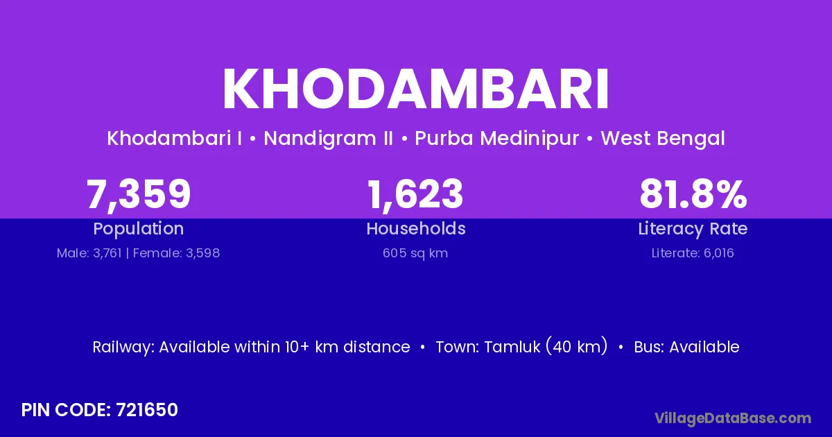 Tamluk (40 km) is the nearest town to Khodambari village for major economic activities and is located approximately 40 km away.