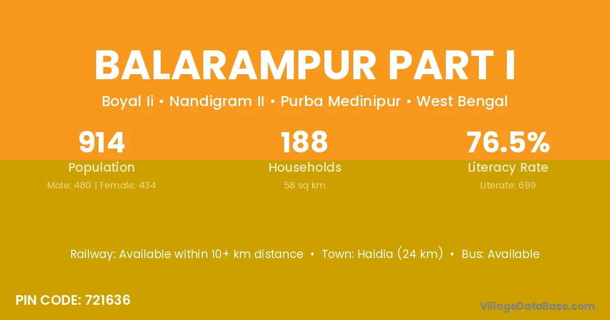 Haldia (24 km) is the nearest town to Balarampur Part I village for major economic activities and is located approximately 24 km away.