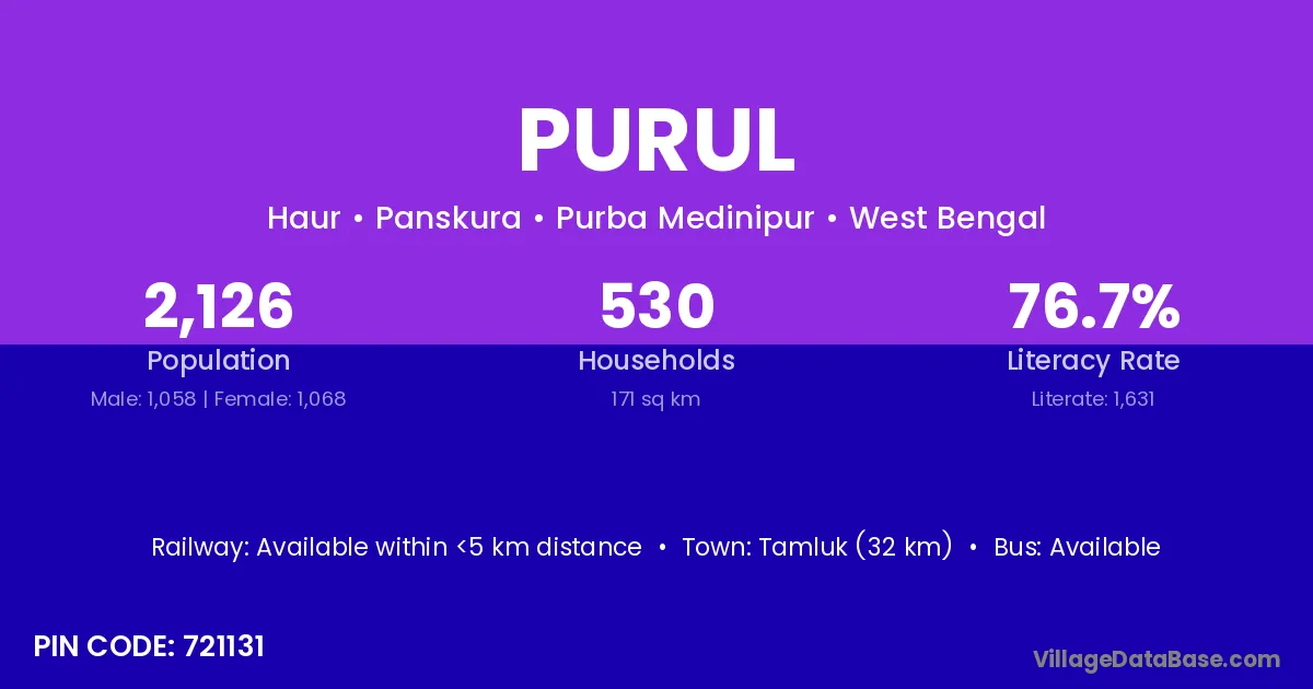 Tamluk (32 km) is the nearest town to Purul village for major economic activities and is located approximately 32 km away.