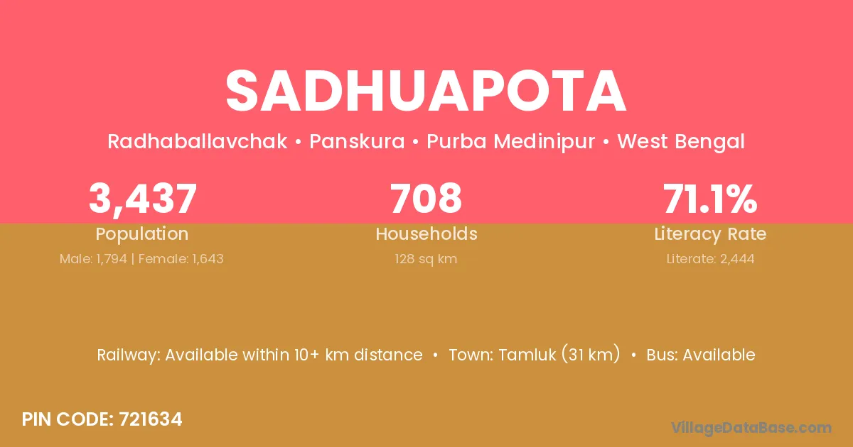 Tamluk (31 km) is the nearest town to Sadhuapota village for major economic activities and is located approximately 31 km away.