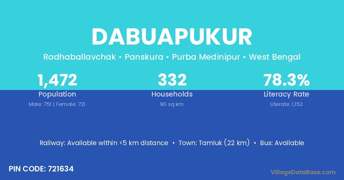 Tamluk (22 km) is the nearest town to Dabuapukur village for major economic activities and is located approximately 22 km away.