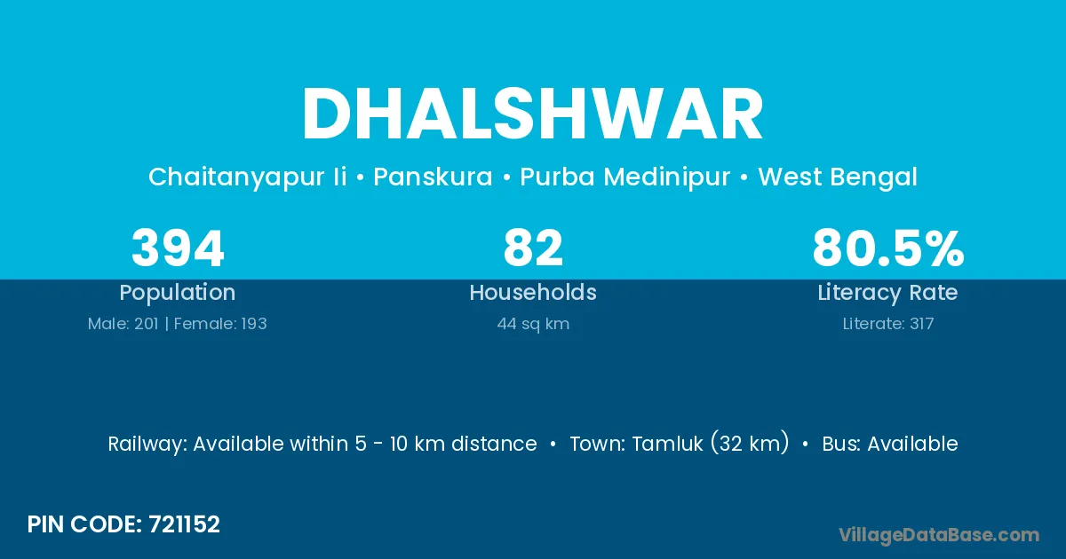 Tamluk (32 km) is the nearest town to Dhalshwar village for major economic activities and is located approximately 32 km away.