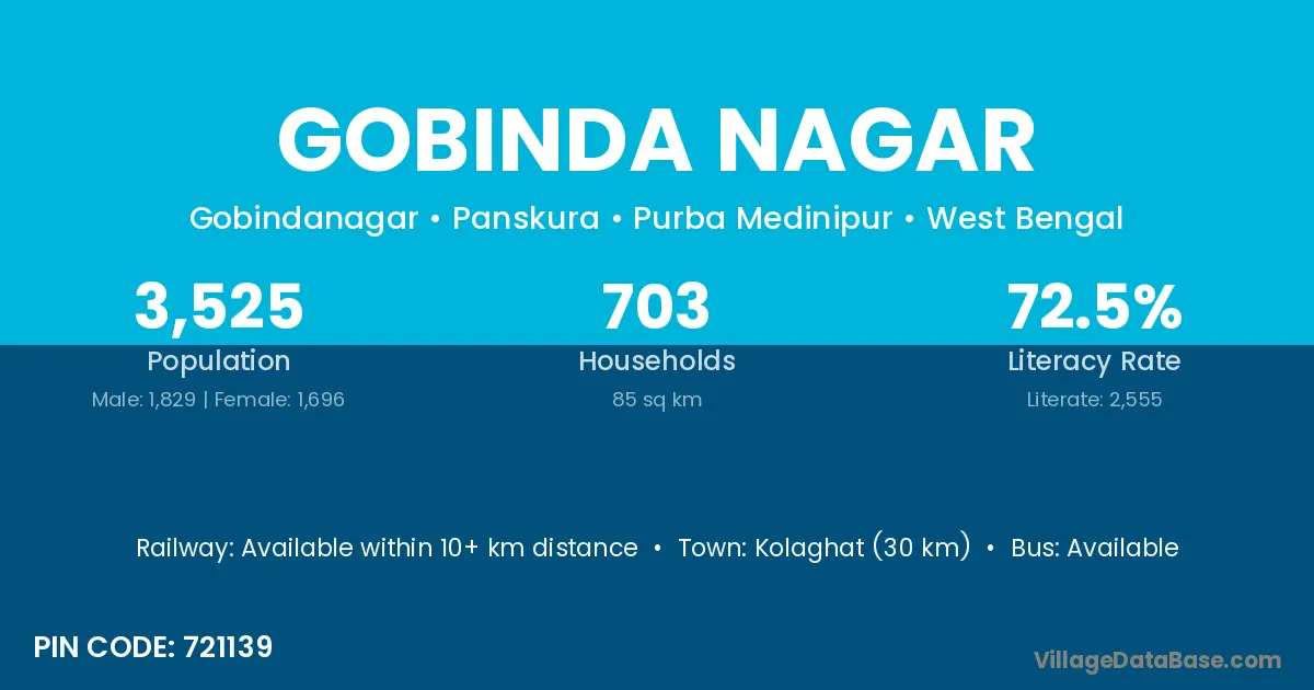 Kolaghat (30 km) is the nearest town to Gobinda Nagar village for major economic activities and is located approximately 30 km away.
