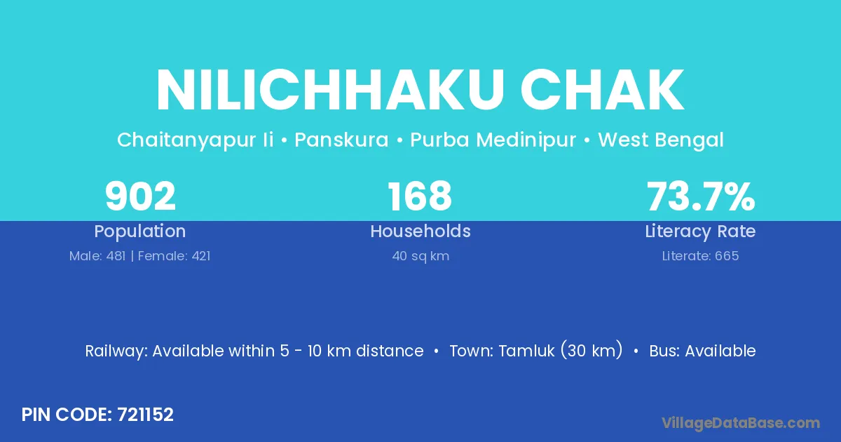 Tamluk (30 km) is the nearest town to Nilichhaku Chak village for major economic activities and is located approximately 30 km away.
