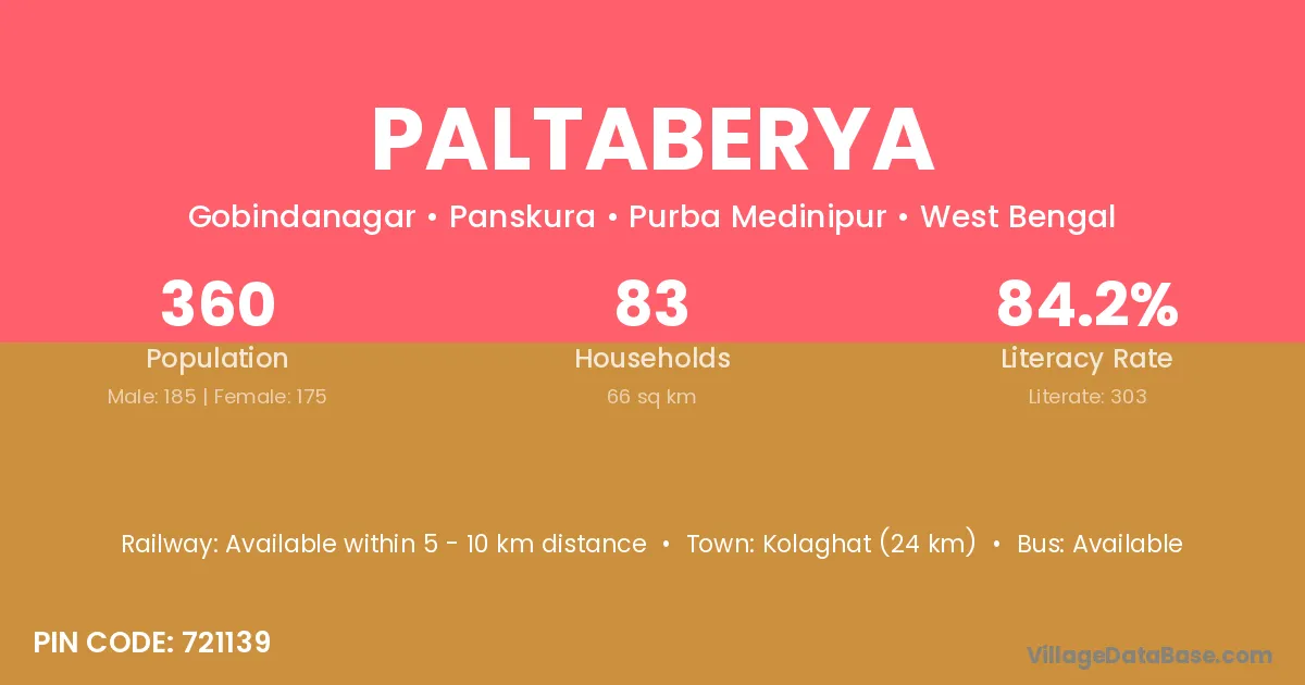 Kolaghat (24 km) is the nearest town to Paltaberya village for major economic activities and is located approximately 24 km away.