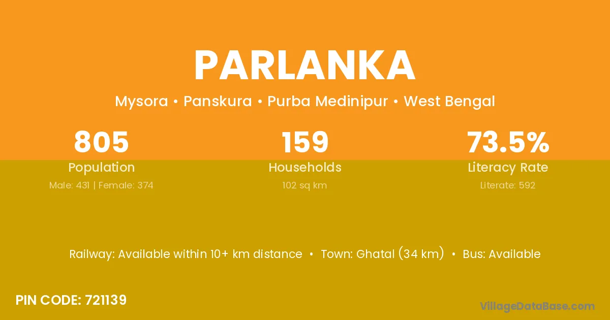 Ghatal (34 km) is the nearest town to Parlanka village for major economic activities and is located approximately 34 km away.