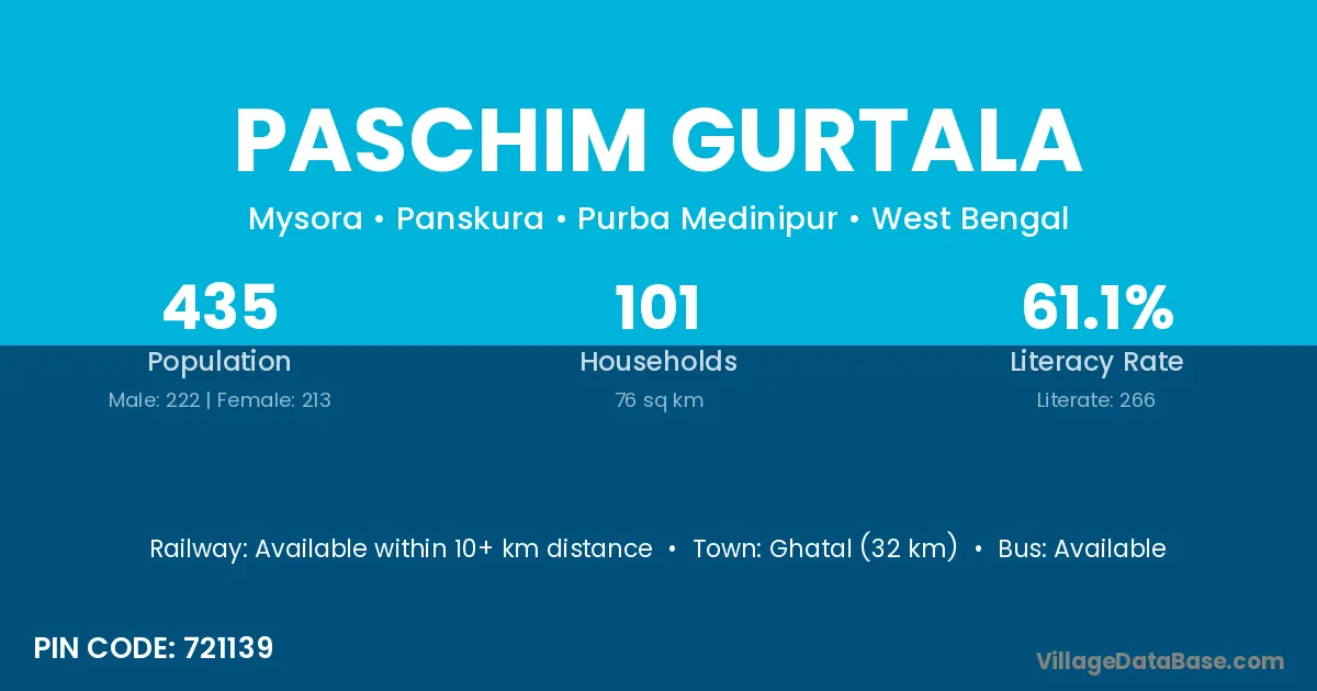 Ghatal (32 km) is the nearest town to Paschim Gurtala village for major economic activities and is located approximately 32 km away.