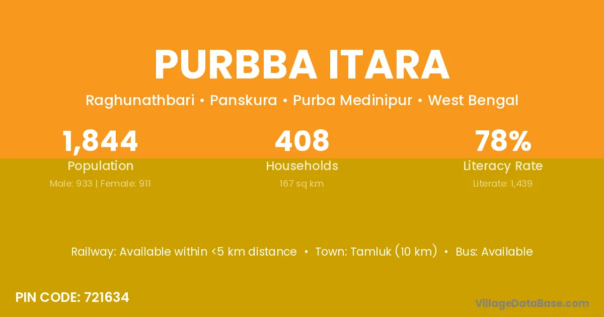 Tamluk (10 km) is the nearest town to Purbba Itara village for major economic activities and is located approximately 10 km away.