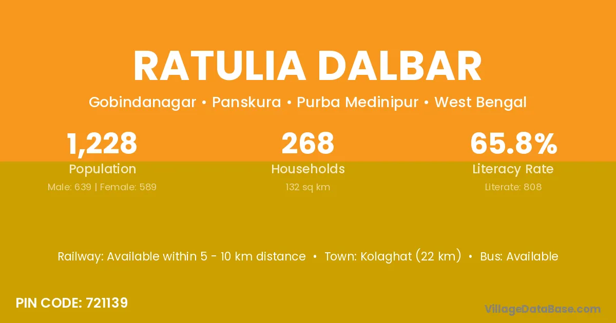 Kolaghat (22 km) is the nearest town to Ratulia Dalbar village for major economic activities and is located approximately 22 km away.