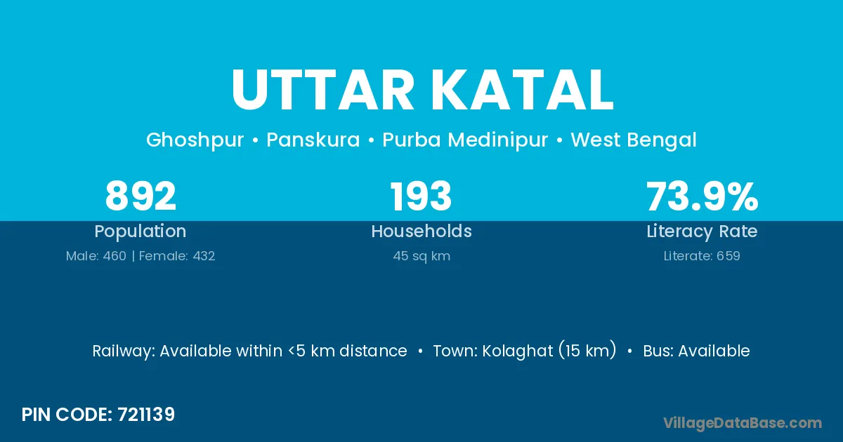 Kolaghat (15 km) is the nearest town to Uttar Katal village for major economic activities and is located approximately 15 km away.