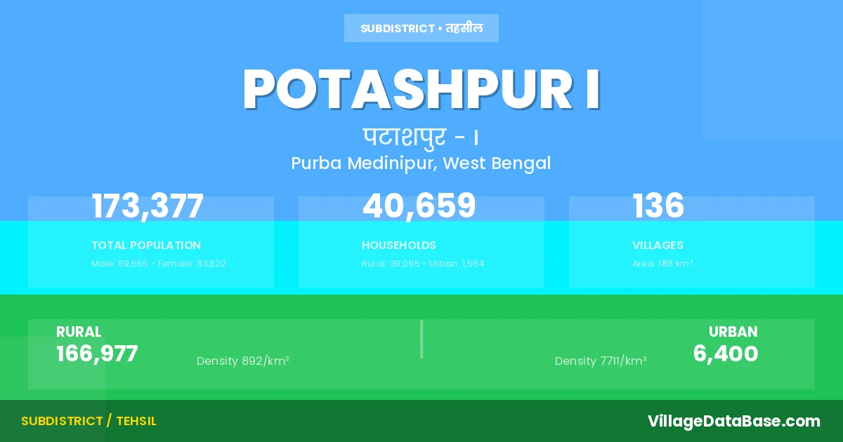 According to the 2011 census The total area of Potashpur I Subdivision is 188 km², with a population of 173377 people. The population density is 923 inhabitants per square kilometre, and there are approximately 40659 houses in the sub district.