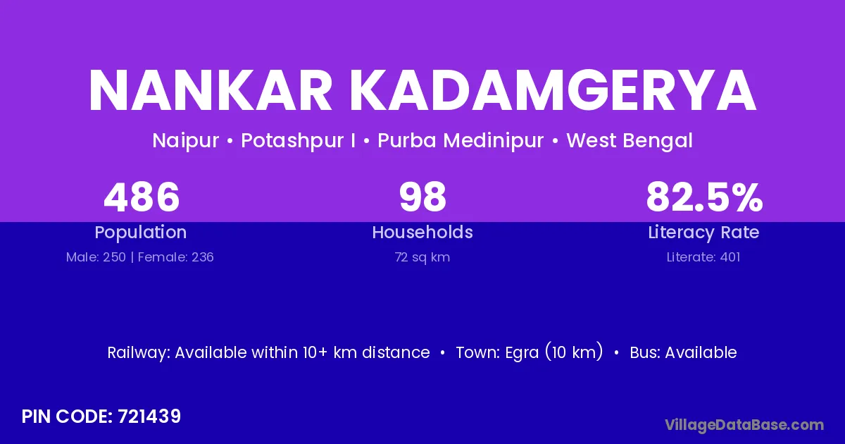Egra (10 km) is the nearest town to Nankar Kadamgerya village for major economic activities and is located approximately 10 km away.