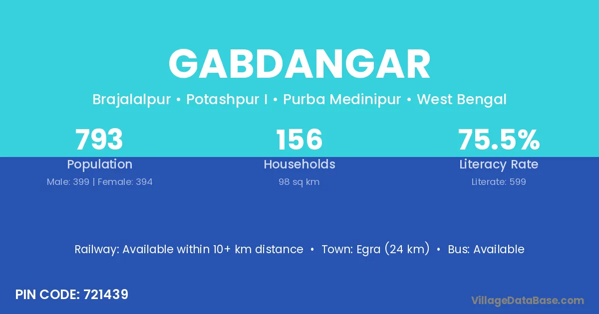 Egra (24 km) is the nearest town to Gabdangar village for major economic activities and is located approximately 24 km away.