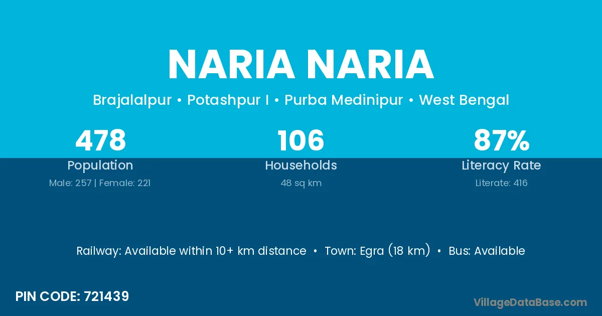 Naria Naria village is located in the Potashpur I Subdivision of the Purba Medinipur district in West Bengal.