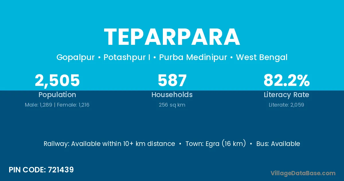 Egra (16 km) is the nearest town to Teparpara village for major economic activities and is located approximately 16 km away.