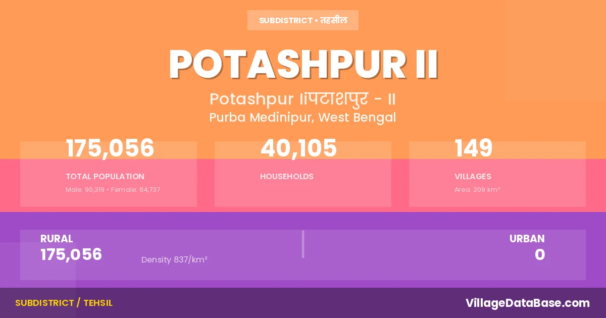According to the 2011 census The total area of Potashpur II Subdivision is 209 km², with a population of 175056 people. The population density is 837 inhabitants per square kilometre, and there are approximately 40105 houses in the sub district.