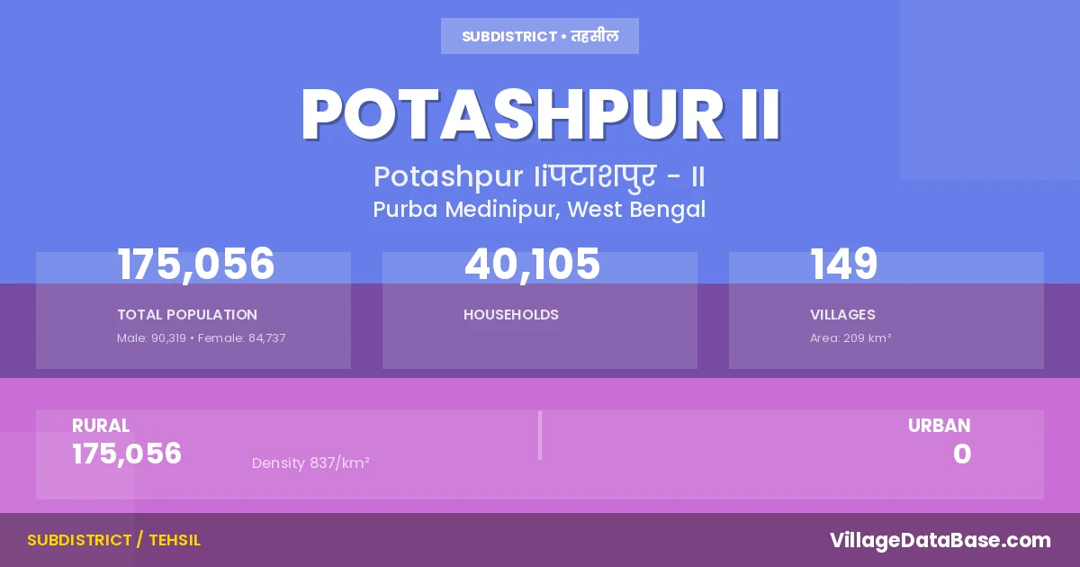According to the 2011 census The total area of Potashpur II Subdivision is 209 km², with a population of 175056 people. The population density is 837 inhabitants per square kilometre, and there are approximately 40105 houses in the sub district.