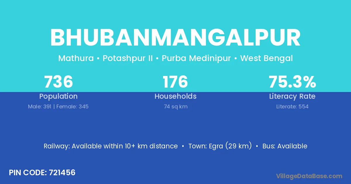 Egra (29 km) is the nearest town to Bhubanmangalpur village for major economic activities and is located approximately 29 km away.