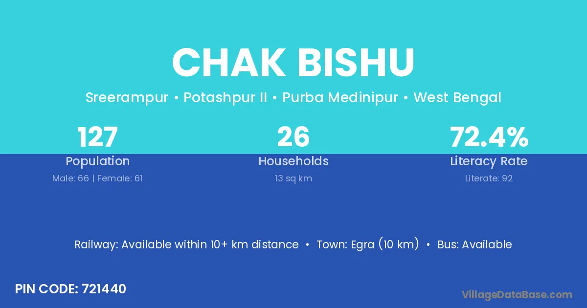Egra (10 km) is the nearest town to Chak Bishu village for major economic activities and is located approximately 10 km away.
