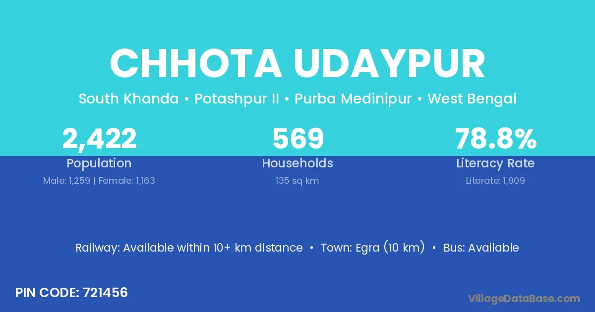 Egra (10 km) is the nearest town to Chhota Udaypur village for major economic activities and is located approximately 10 km away.