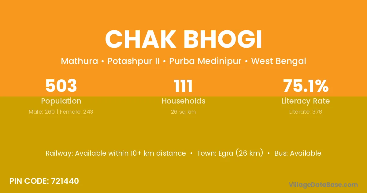 Egra (26 km) is the nearest town to Chak Bhogi village for major economic activities and is located approximately 26 km away.