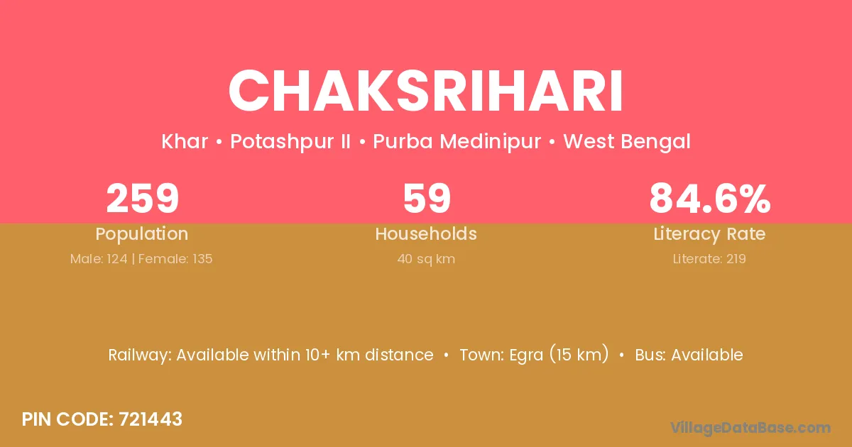 Egra (15 km) is the nearest town to Chaksrihari village for major economic activities and is located approximately 15 km away.