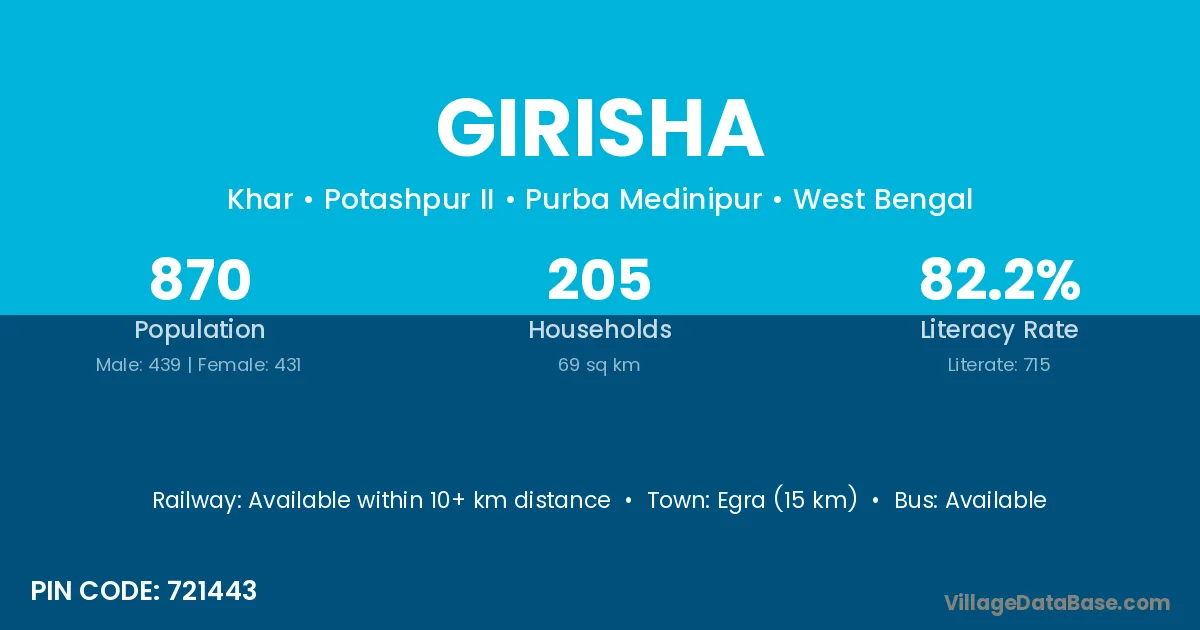 Egra (15 km) is the nearest town to Girisha village for major economic activities and is located approximately 15 km away.
