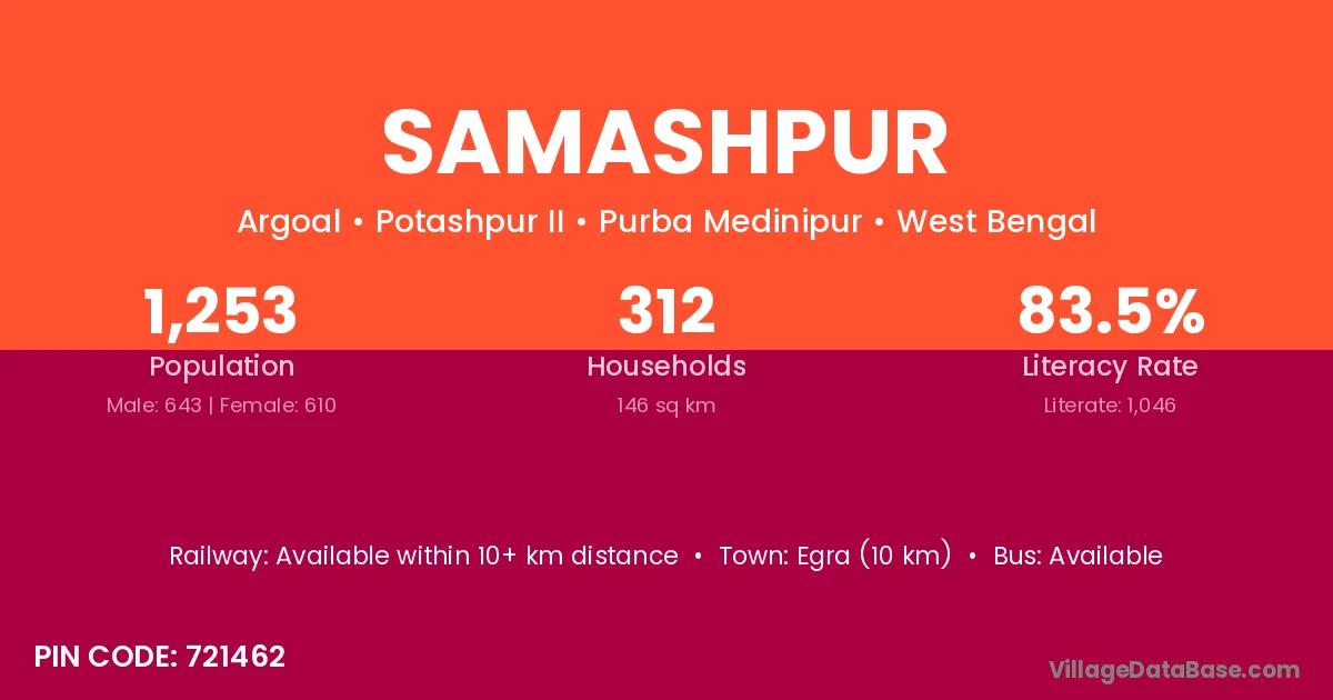 Egra (10 km) is the nearest town to Samashpur village for major economic activities and is located approximately 10 km away.