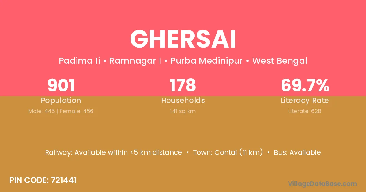 Contai (11 km) is the nearest town to Ghersai village for major economic activities and is located approximately 11 km away.