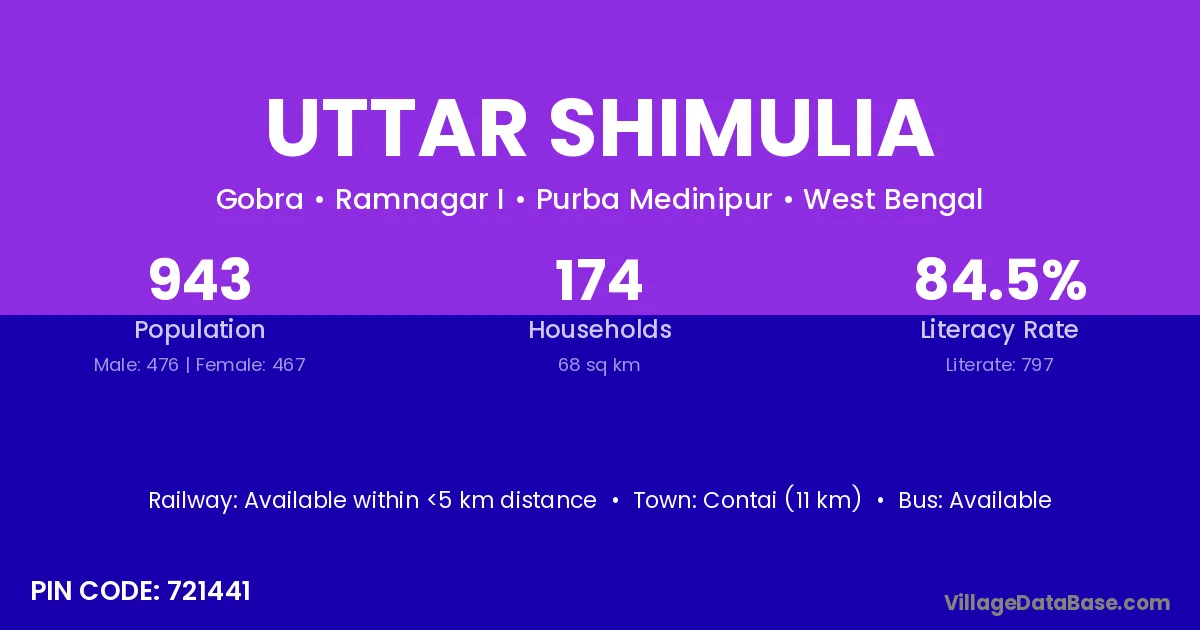 Contai (11 km) is the nearest town to Uttar Shimulia village for major economic activities and is located approximately 11 km away.