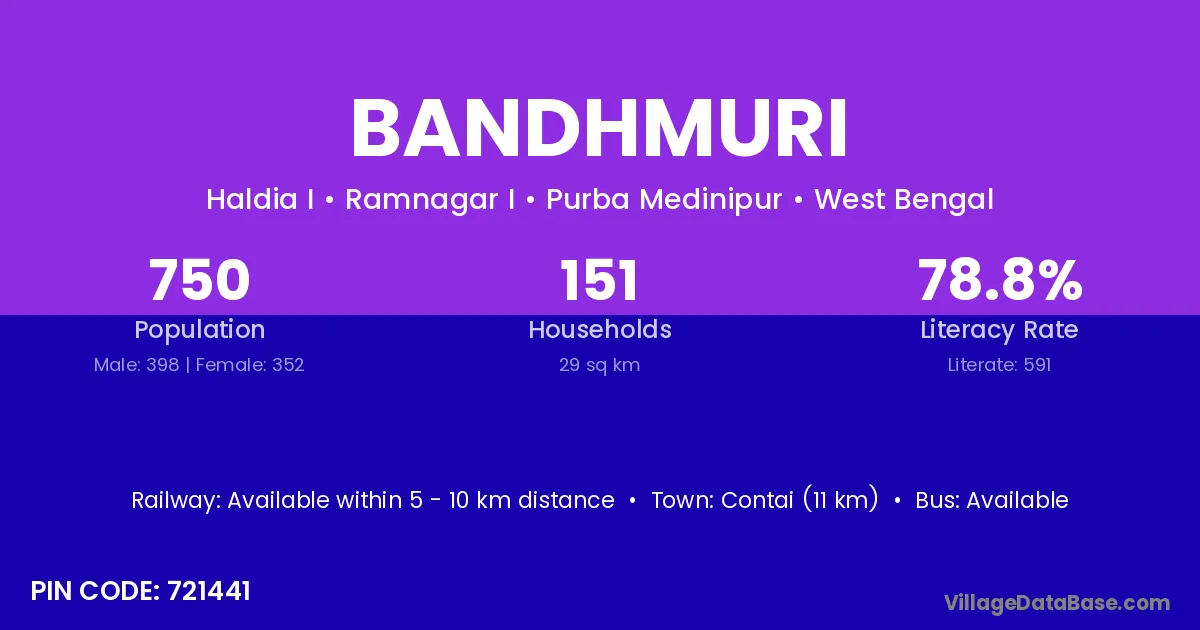 Contai (11 km) is the nearest town to Bandhmuri village for major economic activities and is located approximately 11 km away.
