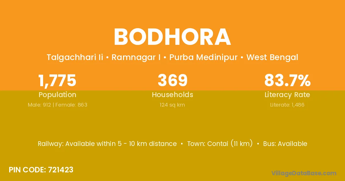 Contai (11 km) is the nearest town to Bodhora village for major economic activities and is located approximately 11 km away.
