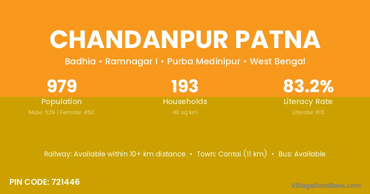 Contai (11 km) is the nearest town to Chandanpur Patna village for major economic activities and is located approximately 11 km away.