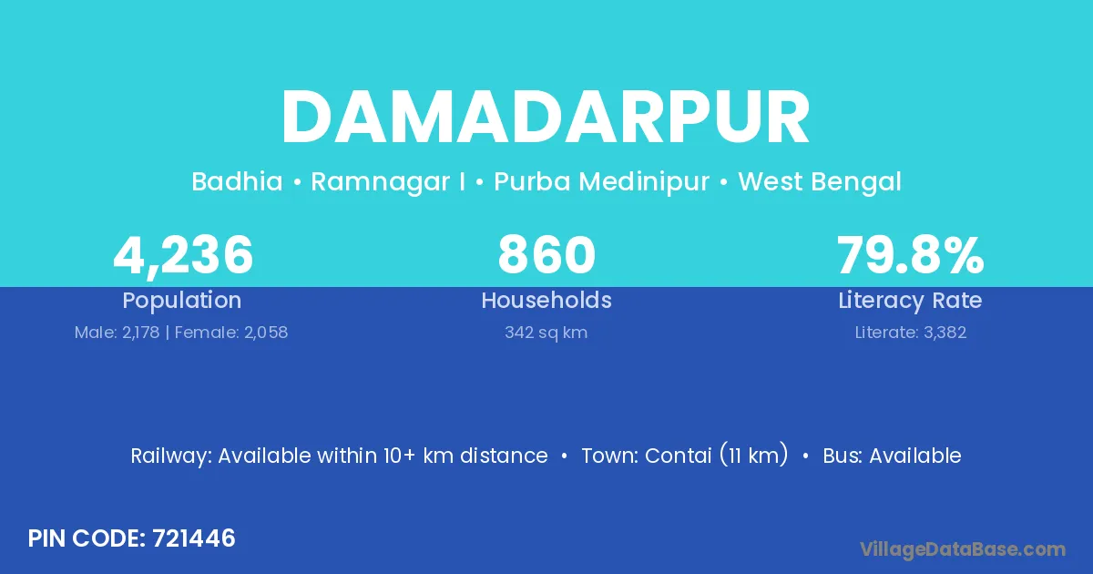 Contai (11 km) is the nearest town to Damadarpur village for major economic activities and is located approximately 11 km away.