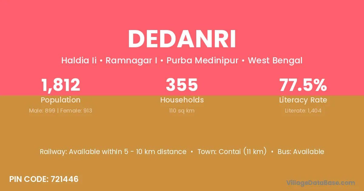 Contai (11 km) is the nearest town to Dedanri village for major economic activities and is located approximately 11 km away.