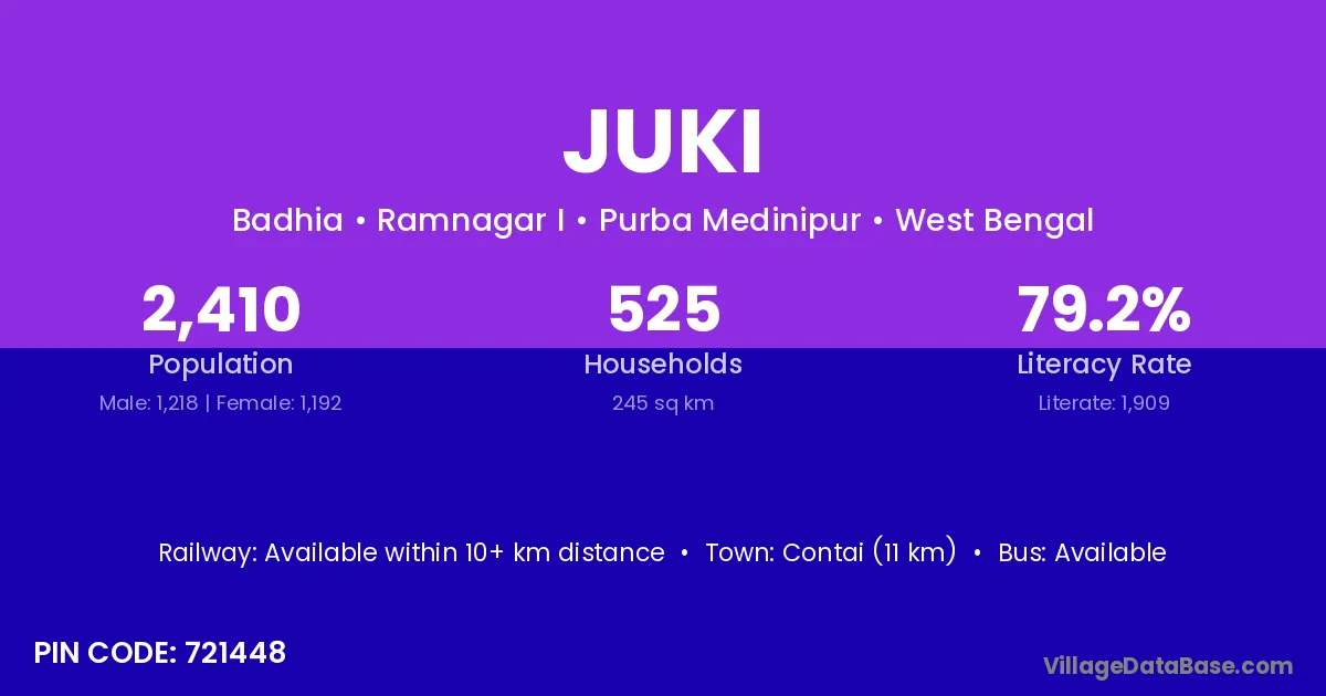 Contai (11 km) is the nearest town to Juki village for major economic activities and is located approximately 11 km away.