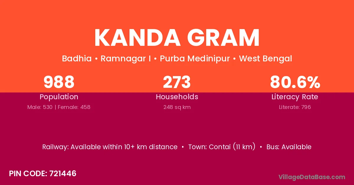Contai (11 km) is the nearest town to Kanda Gram village for major economic activities and is located approximately 11 km away.