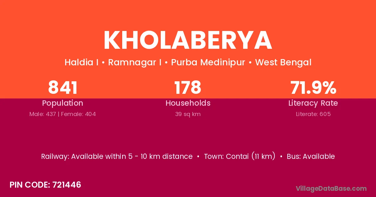 Contai (11 km) is the nearest town to Kholaberya village for major economic activities and is located approximately 11 km away.
