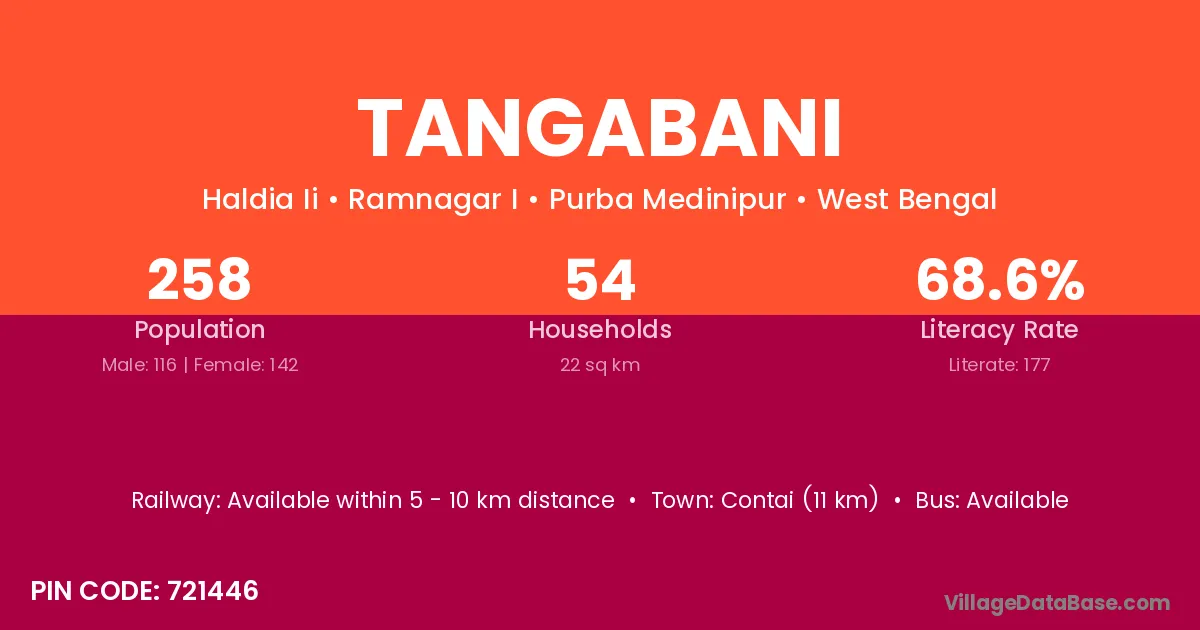 Contai (11 km) is the nearest town to Tangabani village for major economic activities and is located approximately 11 km away.