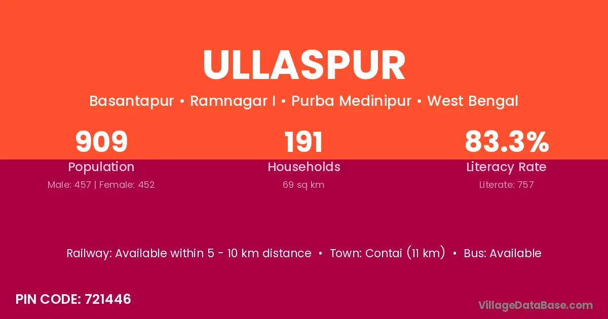 Contai (11 km) is the nearest town to Ullaspur village for major economic activities and is located approximately 11 km away.