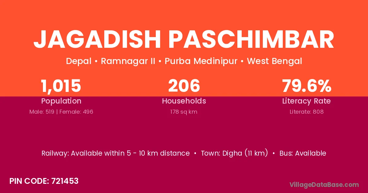 Jagadish Paschimbar village is located in the Ramnagar II Subdivision of the Purba Medinipur district in West Bengal.