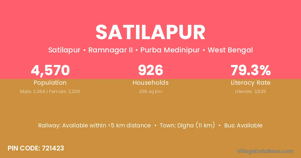Satilapur village is located in the Ramnagar II Subdivision of the Purba Medinipur district in West Bengal.