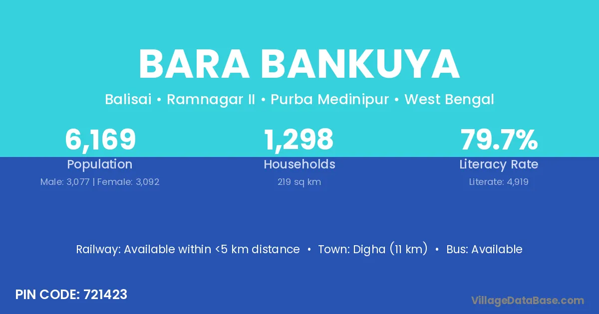 Digha (11 km) is the nearest town to Bara Bankuya village for major economic activities and is located approximately 11 km away.