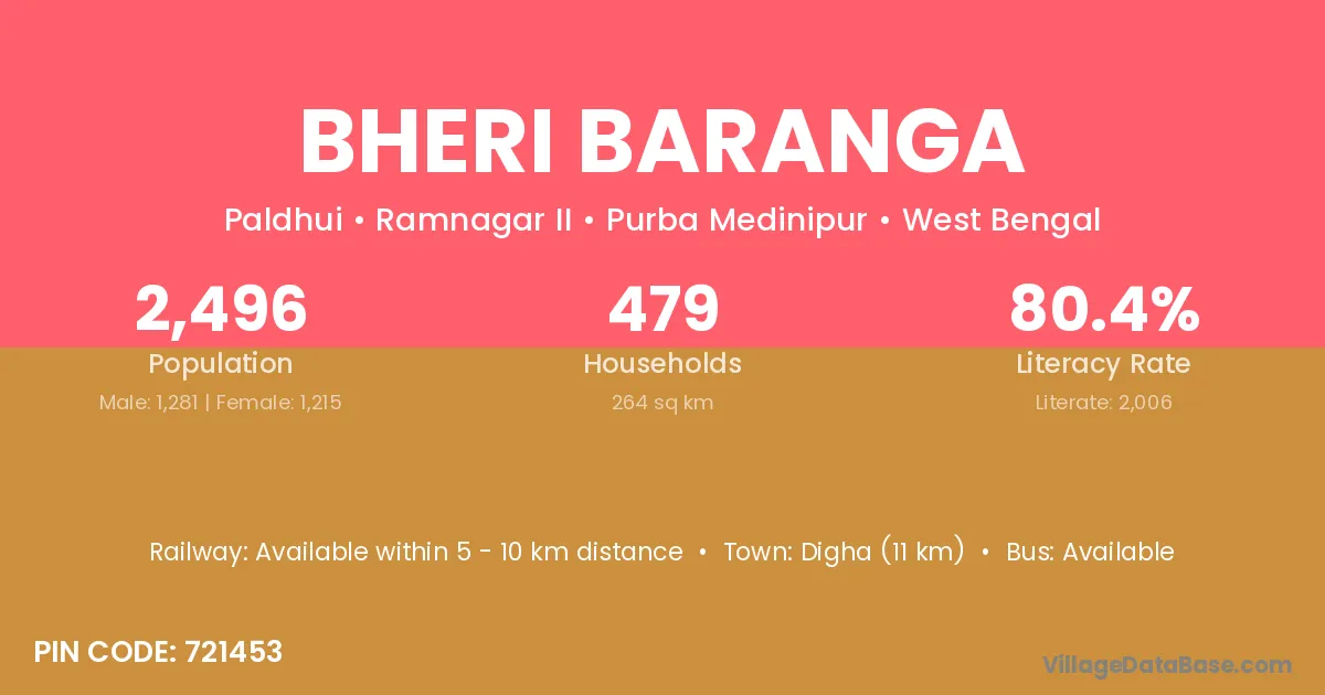 Digha (11 km) is the nearest town to Bheri Baranga village for major economic activities and is located approximately 11 km away.