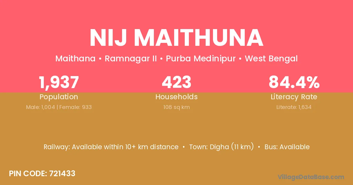 Digha (11 km) is the nearest town to Nij Maithuna village for major economic activities and is located approximately 11 km away.