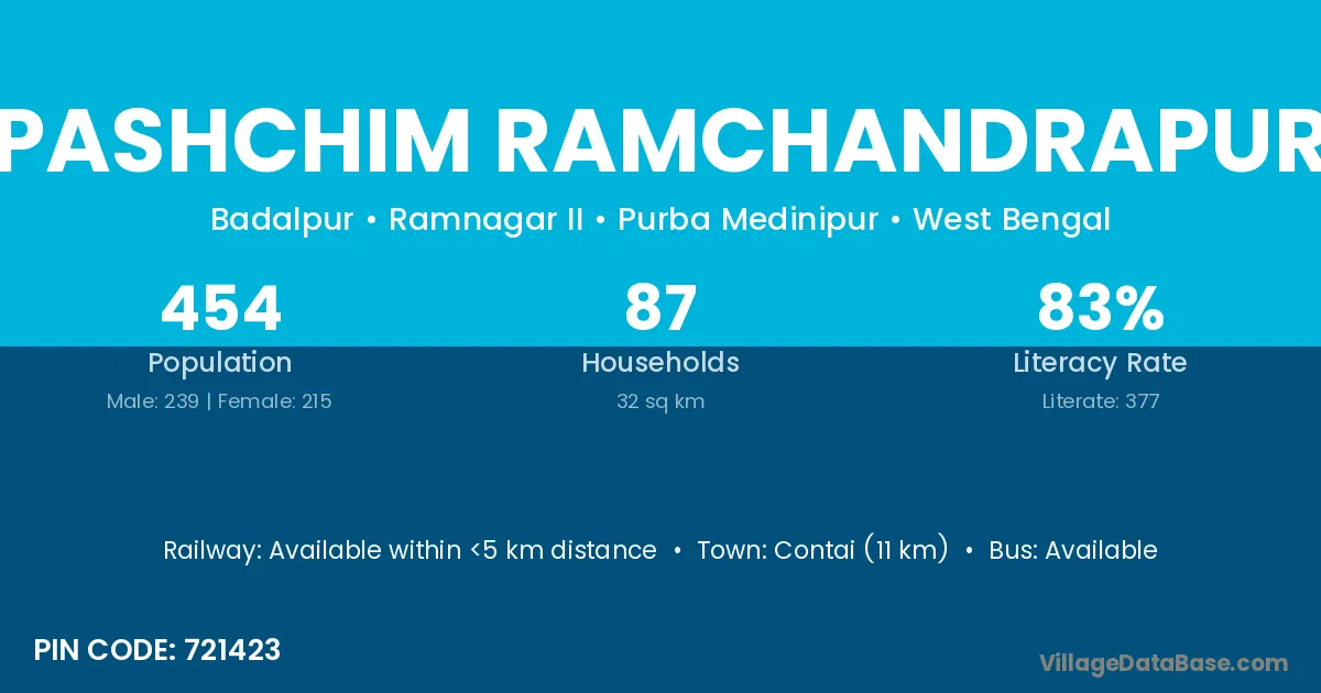 Contai (11 km) is the nearest town to Pashchim Ramchandrapur village for major economic activities and is located approximately 11 km away.